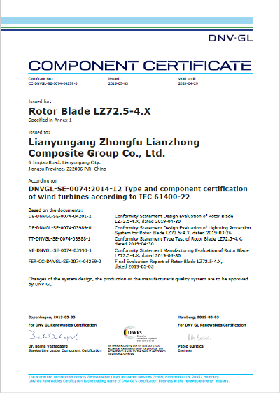 近日,中復連眾收到了DNV GL德國總部發(fā)布的LZ72.5-4.X風(fēng)電葉片型式認證A證書(shū)。該證書(shū)是迄今為止DNV GL頒發(fā)給國內的首張符合IEC標準的4MW級別部件型式認證證書(shū),這標志著(zhù)國際權威機構對中復連眾綜合研發(fā)實(shí)力和制造品質(zhì)的充分認可。另外該型號也是目前國內獲得DNV GL A型式認證證書(shū)中長(cháng)度最長(cháng)、功率最高的葉片。