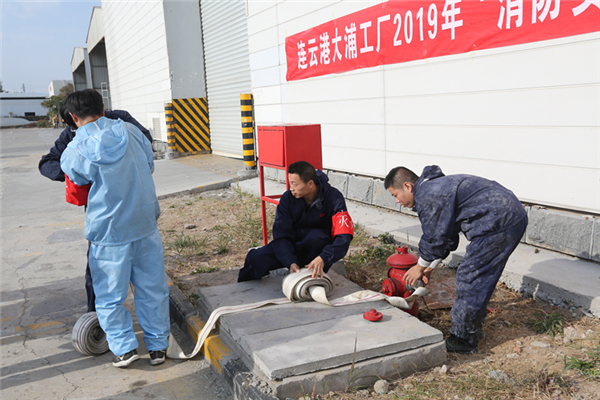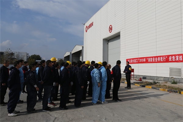 本次演練模擬連云港工廠(chǎng)10#油漆車(chē)間因電器隱患發(fā)生火災,導致大量物資和人員被困。9點(diǎn)50分,各參演隊伍集結完畢準備演練。10點(diǎn)整,通訊組接報警、報告火情,第一時(shí)間啟動(dòng)消防應急預案,向119報警后開(kāi)展初期火災滅火、人員疏散、救護、物資轉移、警戒、切斷廠(chǎng)區雨水排口等搶險工作,葉片生產(chǎn)部機修電工切斷火災現場(chǎng)電源、對儲氣罐進(jìn)行人工卸壓防范爆炸,消防泵房啟動(dòng)加壓水泵。隨著(zhù)火情不斷擴大,模擬的相鄰油漆車(chē)間發(fā)生著(zhù)火,向110、120報警后繼續組織滅火。10點(diǎn)15分,接警后開(kāi)發(fā)區消防救援隊三輛消防車(chē)入廠(chǎng)開(kāi)展滅火救援,期間,通訊組向消防救援隊報告車(chē)間可能還有人員,救援隊使用專(zhuān)用工具強行破拆變形大門(mén),對車(chē)間內部迅速開(kāi)展搜救,并將被困人員救出。10點(diǎn)20分,火災得到控制并完全滅火,總指揮指示清點(diǎn)人員、盤(pán)點(diǎn)物資、檢查損失、檢查消防尾水等工作。