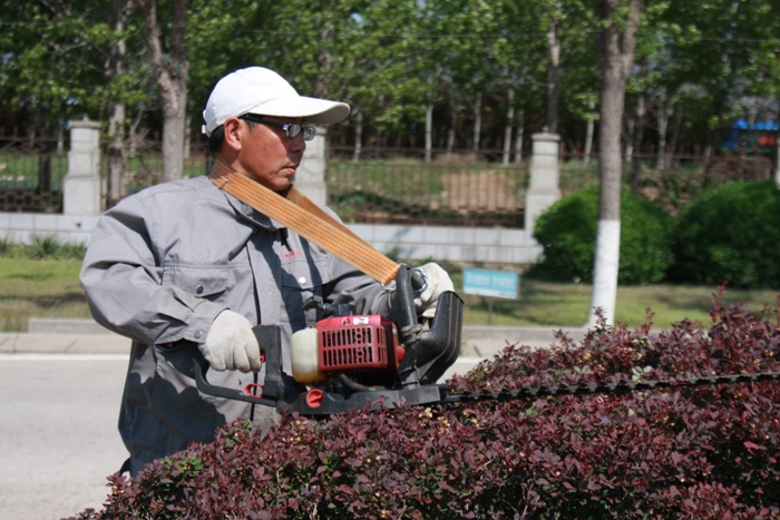 此時(shí)年近六旬的王昌嶺師傅正在給花木澆水,王師傅是園林綠化養護師,主要負責廠(chǎng)區內花木的養護工作。因為廠(chǎng)區取水點(diǎn)少,公司大面積的綠化區域要靠人工安裝水管澆水,有些偏遠處水管接觸不到的只有通過(guò)水桶拎水,這在時(shí)間上花費就比較長(cháng),無(wú)形當中也增加了工作量,王師傅不急不緩的做著(zhù)自己的工作。為了減輕師傅們的工作量,公司還多次組織員工在園區內進(jìn)行除草、澆水活動(dòng)。