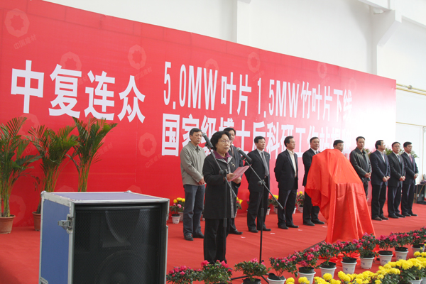宋志平、王建華、徐一平、秦海巖、張定金共同為5MW風(fēng)力機葉片及1.5MW竹葉片成功下線(xiàn)揭幕。馬建國、金凡為中復連眾國家級博士后科研工作站揭牌。
