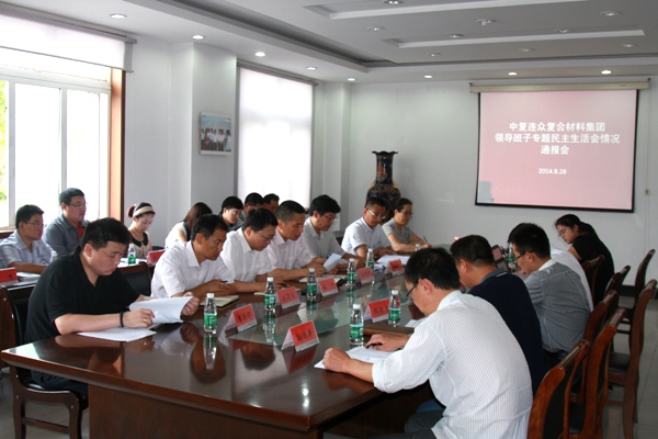 2014年8月28日,中復連眾召開(kāi)了黨的群眾路線(xiàn)教育實(shí)踐活動(dòng)領(lǐng)導班子專(zhuān)題民主生活會(huì )情況通報會(huì ),中國復材集團副總經(jīng)理、中復連眾黨委書(shū)記、總經(jīng)理喬光輝代表公司黨委通報領(lǐng)導班子專(zhuān)題民主生活會(huì )有關(guān)情況,中國復材集團督導組副組長(cháng)、黨委辦公室主任傅義紅出席會(huì )議,會(huì )議由中復連眾黨委副書(shū)記、副總經(jīng)理王彤兵主持。公司領(lǐng)導班子、中層以上黨員干部和職工代表共29人參加會(huì )議。