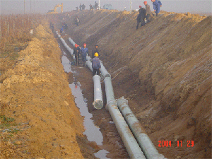 山東海陽(yáng)核電廠(chǎng)施工用水管道一期工程總長(cháng)8公里,為2條DN350的玻璃鋼管道平行鋪設,整個(gè)工程共使用了中復連眾的玻璃鋼管道約16000米,管道壓力等級為1.0Mpa,產(chǎn)品執行JC552-94標準, 此項目由中復連眾自行安裝,在已經(jīng)進(jìn)行過(guò)的三個(gè)水壓試驗段的水壓試驗均一次性打壓通過(guò),受到了山東核電有限公司和核工業(yè)四達建設監理公司的高度評價(jià).