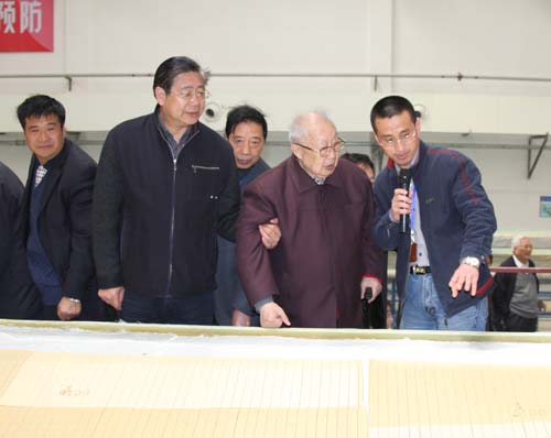 中復連眾副總經(jīng)理王彤兵首先對省級老干部考察團的到來(lái)表示歡迎,并向考察團介紹了中復連眾風(fēng)力發(fā)電機葉片的生產(chǎn)工藝。目前中復連眾生產(chǎn)的風(fēng)力發(fā)電機葉片主要基材為環(huán)氧樹(shù)脂,產(chǎn)品設計使用壽命為20年。去年年底中復連眾已成功躍居國內最大的兆瓦級風(fēng)力發(fā)電機葉片生產(chǎn)企業(yè),2008年計劃生產(chǎn)750套風(fēng)力發(fā)電機葉片。