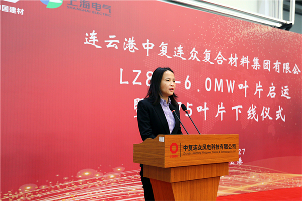 中復連眾集團黨委書(shū)記、總經(jīng)理喬光輝、上海電氣風(fēng)電集團總裁謝雪瓊分別代表合作雙方致辭,中國復材集團黨委書(shū)記、董事長(cháng)、總經(jīng)理劉標,連云港經(jīng)濟技術(shù)開(kāi)發(fā)區黨工委副書(shū)記、常務(wù)副主任胡傳宏對LZ84-6.0MW葉片啟運和B75葉片的成功下線(xiàn)表示祝賀。中復連眾集團副總經(jīng)理、中復連眾風(fēng)電科技有限公司總經(jīng)理梁穎主持儀式。中國建材集團科技部總經(jīng)理郅曉、業(yè)主代表、西門(mén)子技術(shù)團隊及中復連眾集團中層以上干部、中復連眾風(fēng)電科技有限公司員工代表出席儀式。