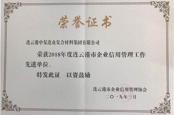 喜訊:中復連眾獲2018年度連云港市信用管理先進(jìn)單位